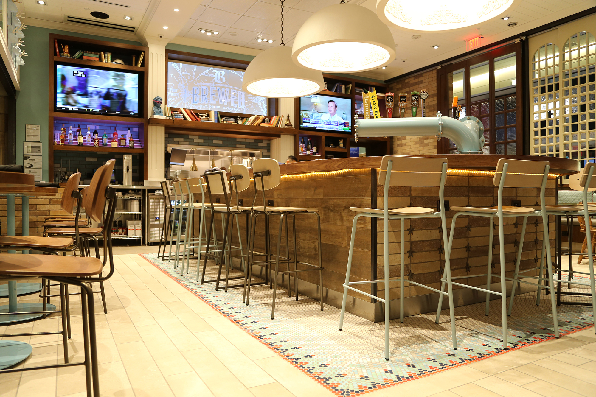 C2 Flooring installed a beautiful tile plank to resemble wood floors and wood plank along the walls. Then, the design was amplified with glazed blue brick tile installed in a herringbone pattern. To complete the look, a silver sparkly mosaic was added on the bar surround as well as pillars throughout. What a great finished look!